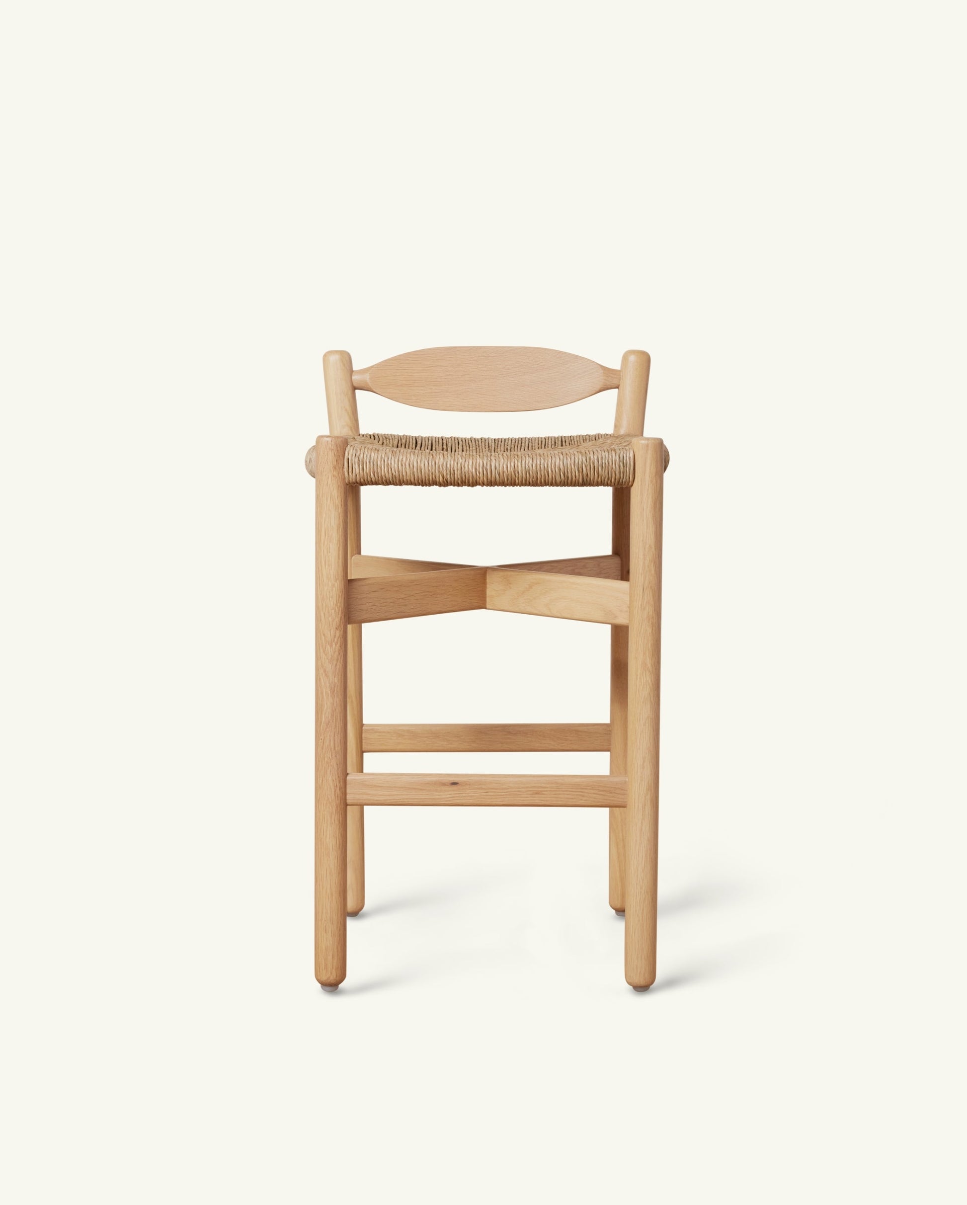 The Olma Stool provides low-back counter seating with elegant charm. The natural woven rush seat and backrest are inspired by timeless European furniture designs, and offer a comfortable seating experience. The solid white oak frame features an X-shaped strut for added stability and style, and is finished with a neutral, anti-yellow stain, preserving its brightness for years to come.