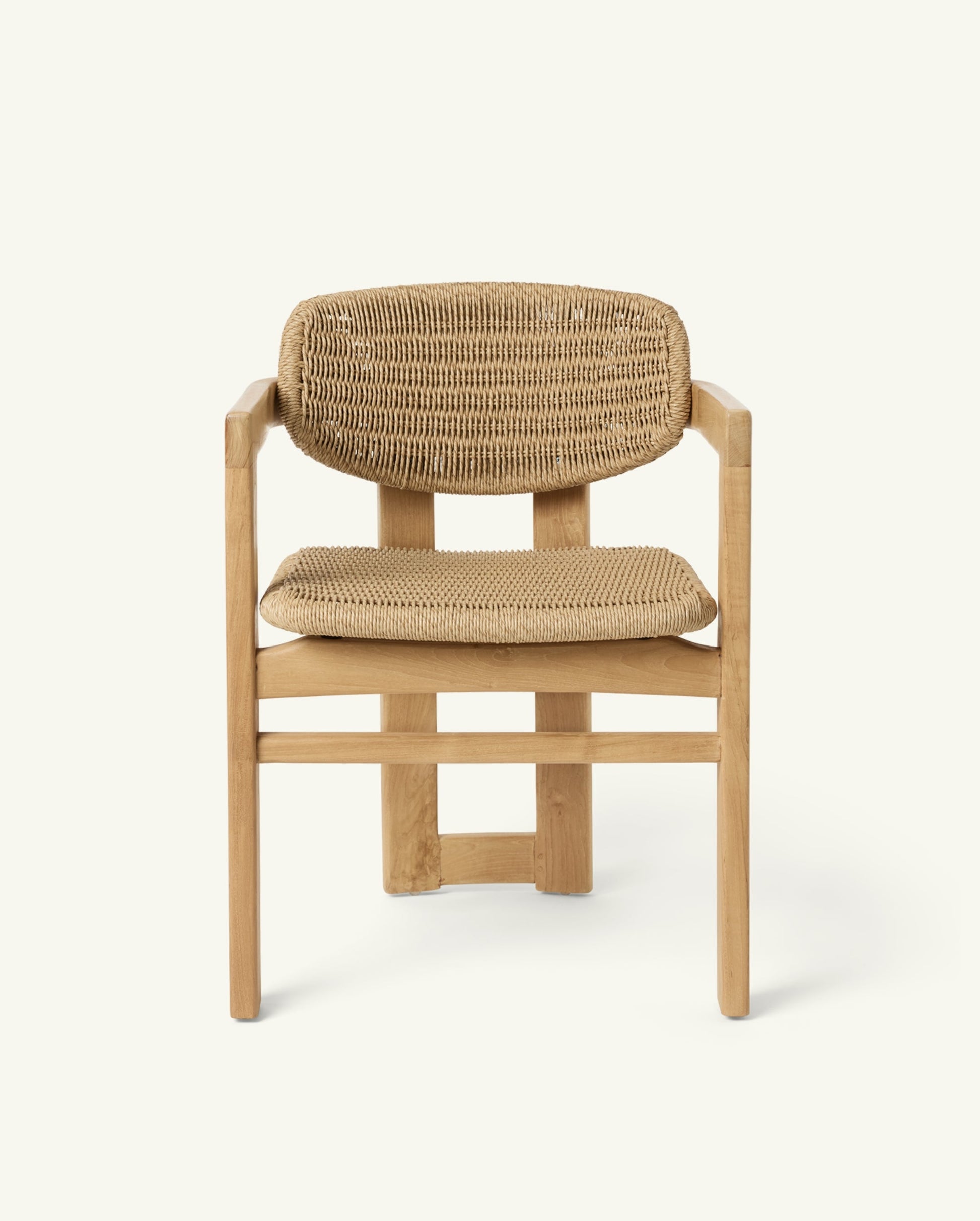 The Vera Dining Chair invites you to relax and enjoy entertaining al fresco with its comfortable curved back, generous seat, and calming neutral finish. The sculptural frame is crafted with high-grade solid teak with a neutral finish to highlight the natural grain. The synthetic rattan matches the texture and aesthetic of a natural fiber, but is UV-treated for outdoor performance.
